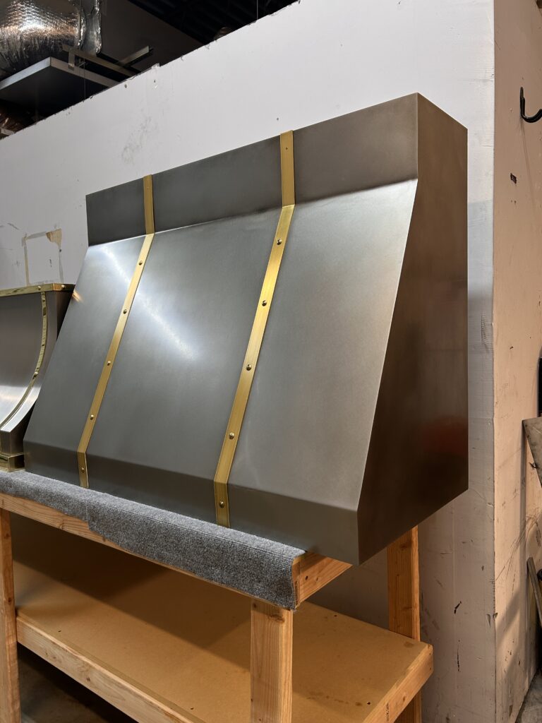 Minimalist by design. Exceptional by execution. Hand-finished stainless steel with a refined patina and antique hand-brushed straps—proof that true luxury lives in the details. #interiordesign #customrangehood #custom #luxury #customhomes