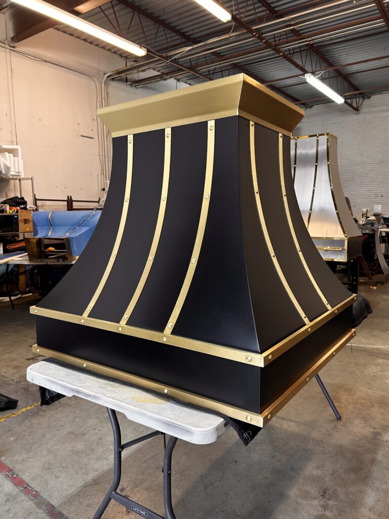 Stunning black matte powder coated and brass Island hood heading to Louisiana this week! #interiordesign #rangehood #kitchendesign #luxurykitchen #customhome #handmade